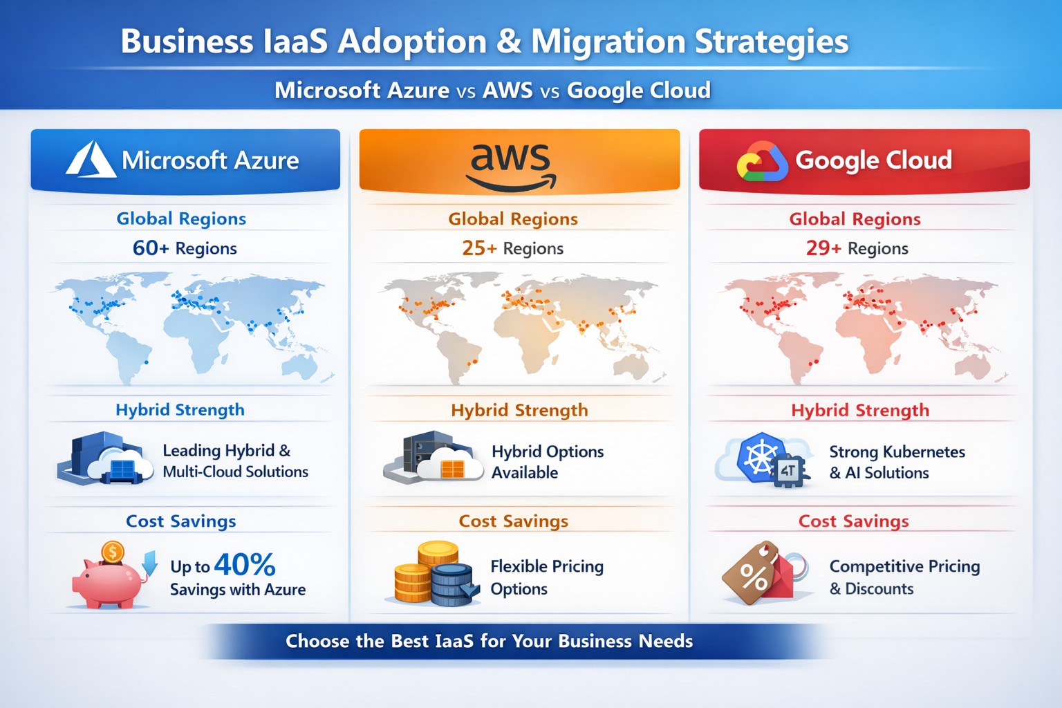 Azure IaaS leads with 60+ regions and hybrid tools, delivering superior ROI for business owners vs AWS EC2 and Google Compute.