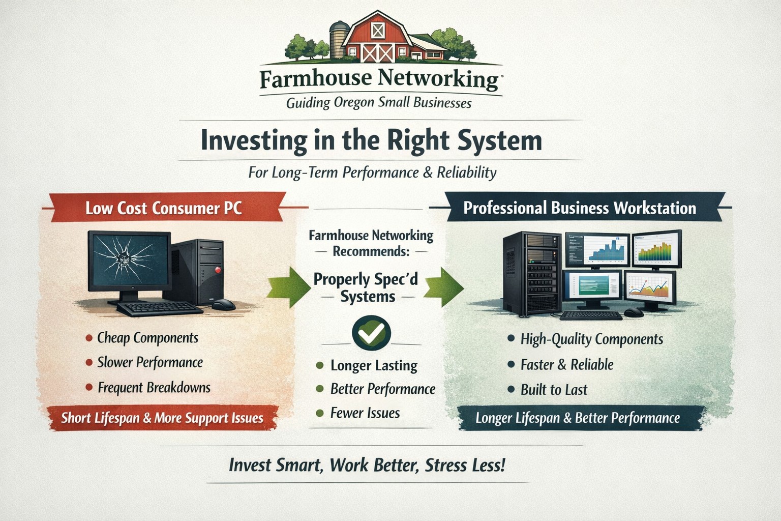 Farmhouse Networking helps small businesses choose new computers where price reflects long term reliability, performance, and lower total cost of ownership.