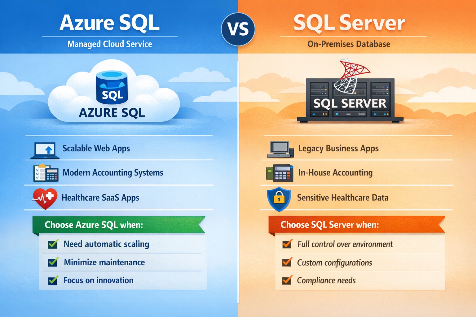 Q: “Can we mix Azure SQL and SQL Server?” Yes. Many businesses use a hybrid approach: core financial or compliance‑sensitive databases on SQL Server, while newer web apps or analytics databases run in Azure SQL.