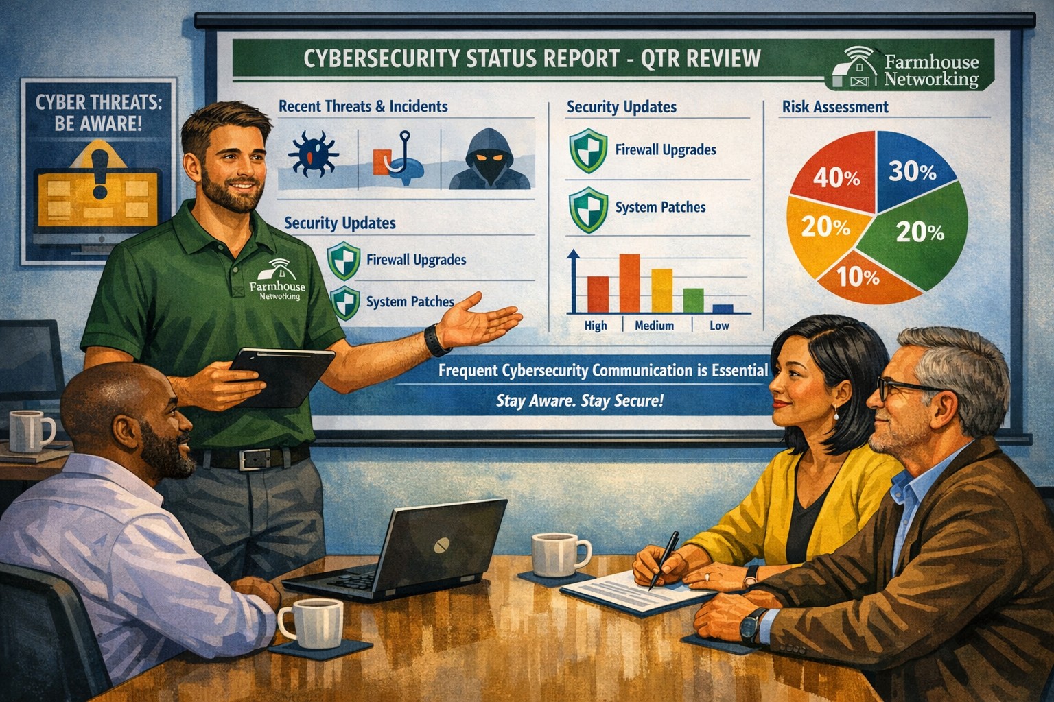 When it comes to cybersecurity, communication is key. If your IT provider has not talked to you recently about cybersecurity, then it is time to call Farmhouse Networking. We are huge on communication and meet regularly with our clients to discuss 42 different IT related categories.