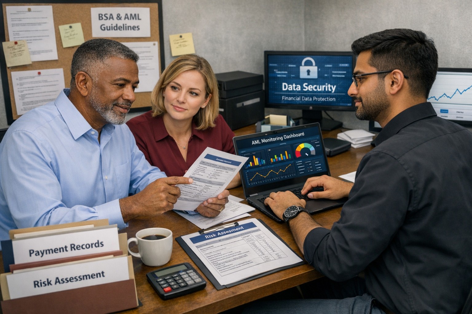 Business owner and IT team working together to strengthen BSA AML compliance, improve financial recordkeeping, and reduce banking risk