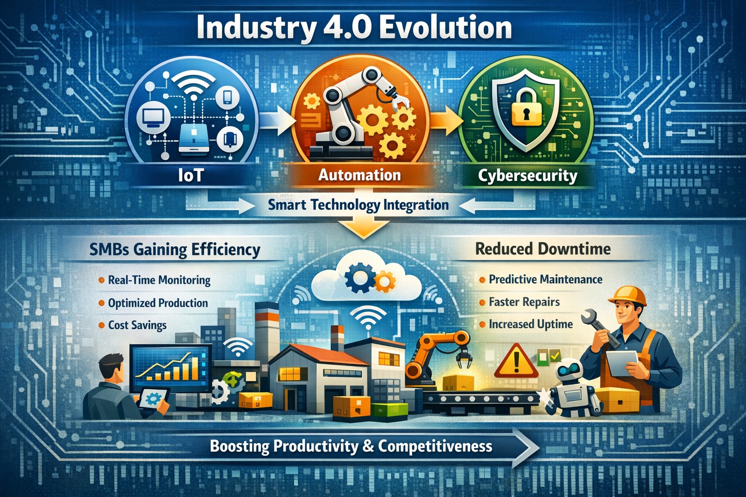 Infographic: Key Industry 4.0 pillars like IoT, AI driving SMB productivity and cost reductions.