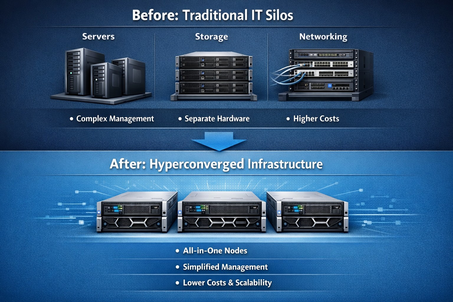 Hyperconvergence consolidates servers, storage, and networking into scalable HCI infrastructure, streamlining small business IT operations.