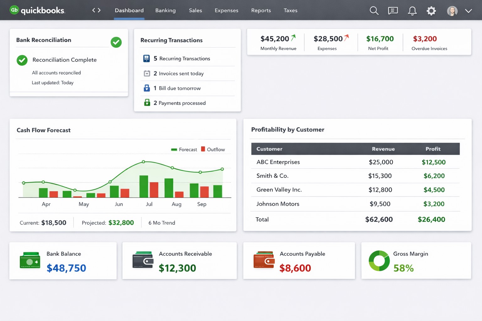 QuickBooks dashboard with automated bank feeds custom reports real-time analytics.