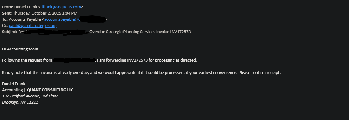 Here is a lesson in the kind of SPAM that AI can generate. It is very well crafted and almost fooled one of our clients into sending almost $50,000 to a hacker. Here is the redacted version of the email:
