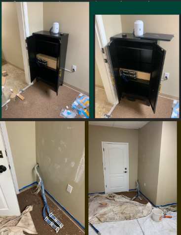 Before and after office network cabling remodel showing messy wires transformed into clean structured cabling installation in Grants Pass office space