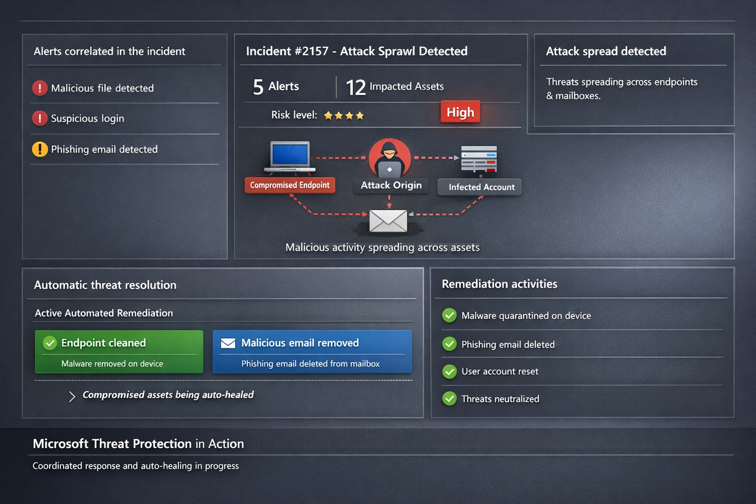 One cyberattack can cripple operations, expose sensitive data, and cost millions in recovery. Microsoft Threat Protection (now evolved into Microsoft 365 Defender) integrates defenses across endpoints, email, identity, and apps to halt attack sprawl—where threats spread unchecked—and automatically heals compromised assets, minimizing downtime and risk.